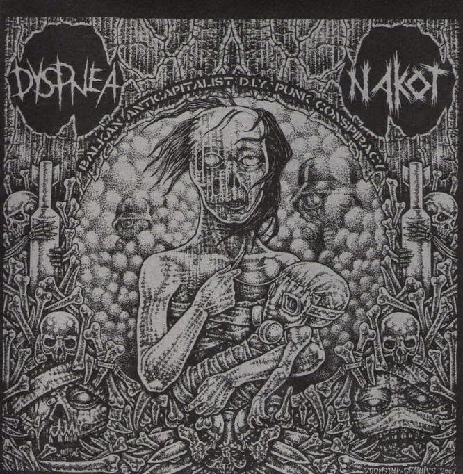 Here is a split of Balkan crust/hardcore:Nakot hail from Belgrade, Serbia, they formed in 2005 and recorded a six track demo in 2007, in 2008 they released a split 7″ w Dazd (Doomed to Extinction Rec.s) and the 12 track discog cd”Pod nato bombama i represijom nasije” on DPH-AK47 distro and tape version on on Doomed to Extinction Records(U$A), the 4 way split LP “Grombiera and Paprika” together with Nulla Osta(Croatia),Corrosive(Germany) and Murder Disco X(Germany). A split with Man Made Filth from Hellgium was announced in their myshit but never saw the light of day.