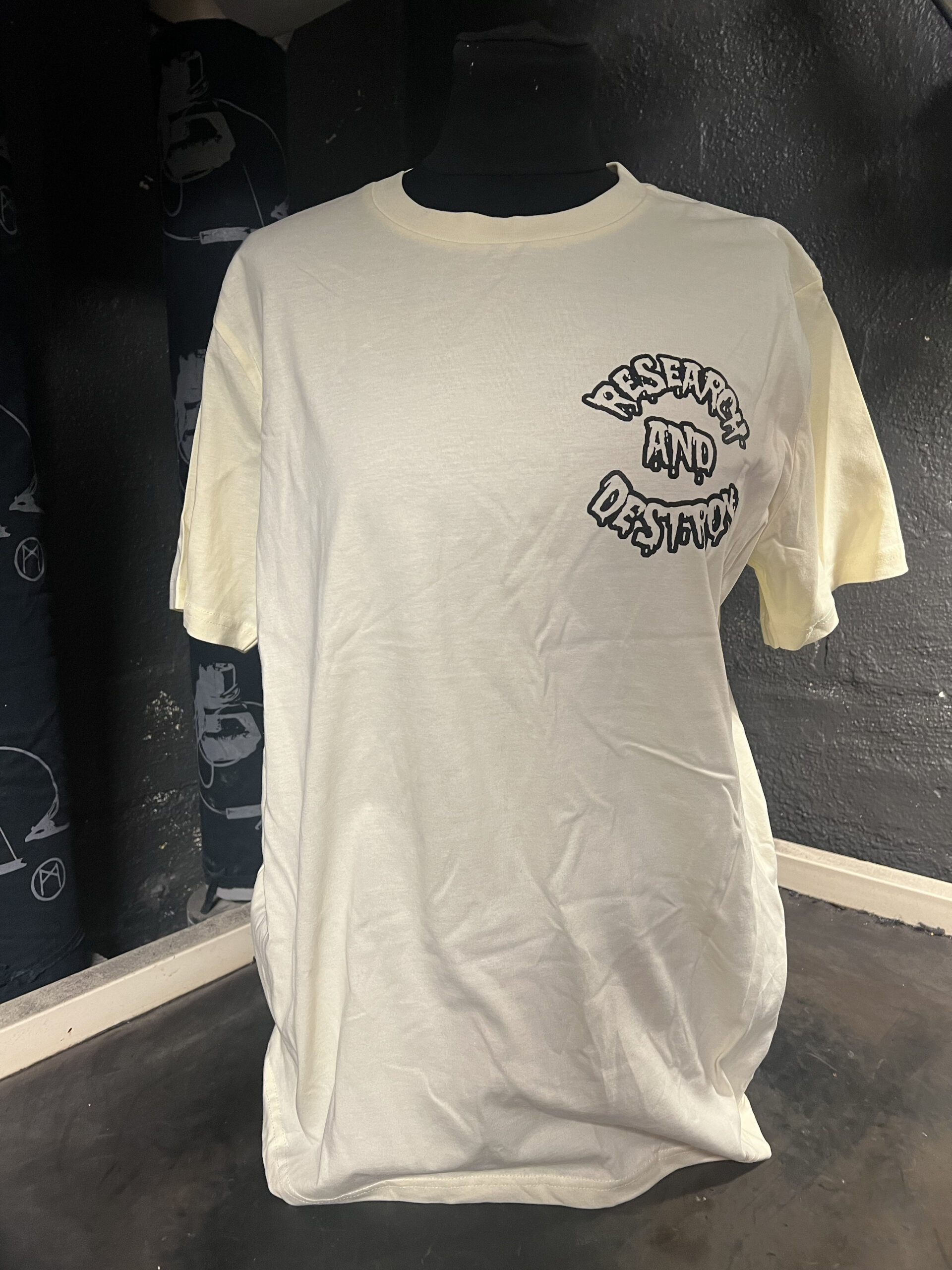 Research and Destroy, light biege round logo – t-shirt